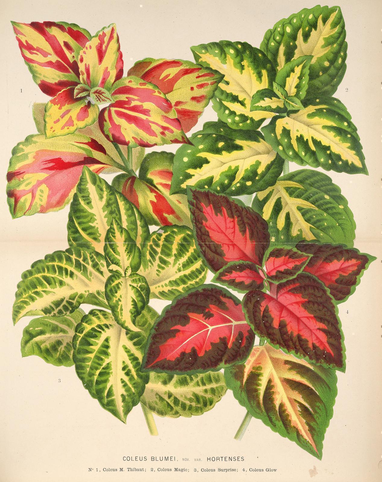 LamiaceaeOriginaria del sur y sudeste de Asia, esta planta tropical es frecuente como planta de interior por su llamativa coloración foliar, con multitud de variaciones con tonos que pueden ser verdes, amarillos, rojos, anaranjados, púrpuras..., todos ellos jaspeados. Sus flores de color azul claro forman minúsculas espigas que suelen pasar completamente desapercibidas.