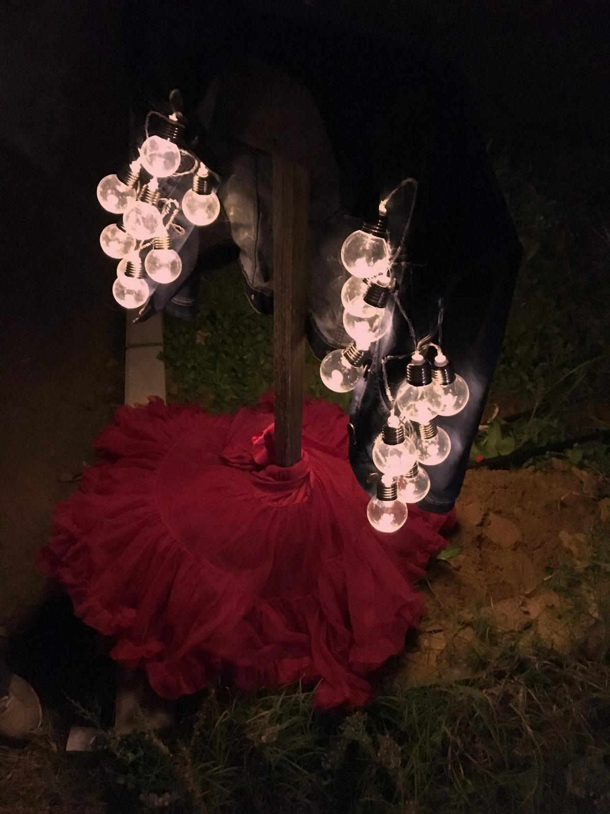 Equipados con las coronas de luz, todos nos dirigimos en un silencio no planificado hasta uno de los huertos de la entrada donde todas las luces rojas permitieron iluminar un momento mágico, Rocío interpretaba un cante de trilla. En este huerto, a la luz roja de las coronas, todo se concentró y parecía que los portadores de las coronas también habían ensayado durante semanas en los huertos. Tras la intervención de Rocío, el bodhran de Elo tomo el relevo y dio comienzo al movimiento de María dentro del huerto, vestida con una chaqueta que parecía hierba. Las luces pasaron de rojas a blancas para acompañar este movimiento y los niños volvieron a encender las suyas como se les había indicado y cuando nos dimos cuenta, el conjunto de los asistentes estaba iluminando intensamente la acción, de nuevo como si lo hubieran estado ensayando. Cuando el movimiento acabó, lo hizo con el sonido inesperado de unos tubos de goma que sorprendieron a todos antes de emprender un paseo más por el huerto a oscuras. De nuevo precedido por el sombrero de Anna, se inicio una procesión hacia el fondo del huerto, encabezada por una melodía interpretado por Elo a dos flautas. Tras ella, deshaciendo la oscuridad, se adivinaban los cuerpos coronados por cincuenta y siete luces. Al final del paseo, todos reunidos, se volvió a interpretar el villancico de la Vega de Triana, esta vez cantado por todos, antes de pasar al chocolate y el anís.