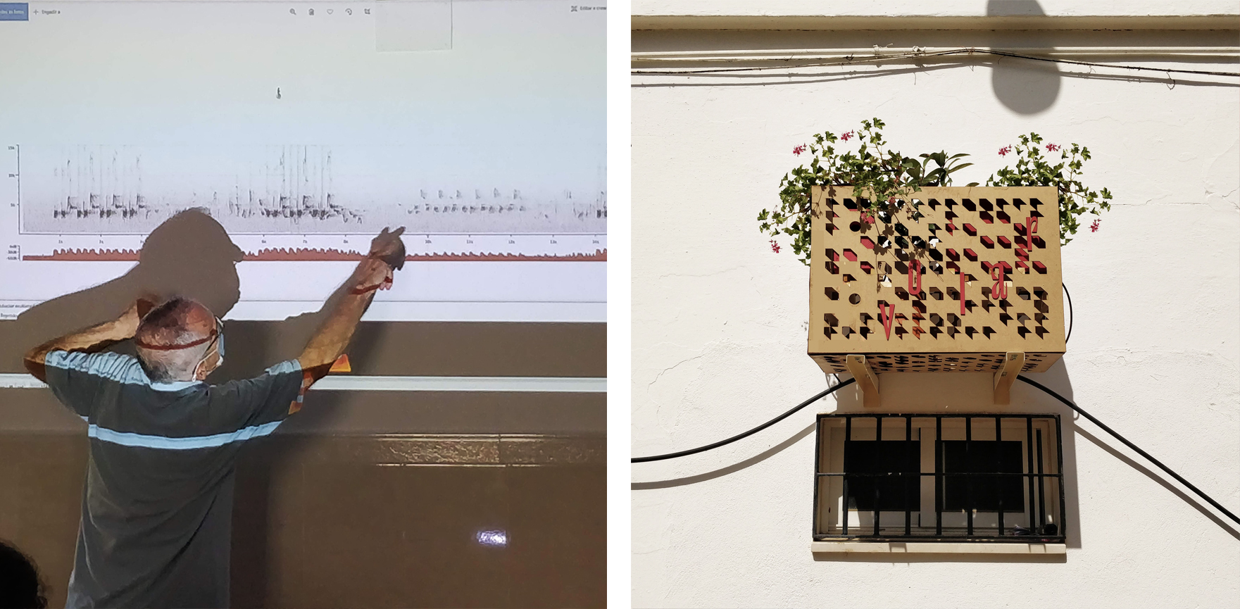 Las dimensiones de la comunidad ornitológica vecina del barrio era la gran desconocida y el gran descubrimiento para el alumnado de los talleres de Luces de Barrio en la Asociación de la Candelaria. Si bien sí que reconocían que el piar de pájaros era una constante en sus rutinas diarias, ni se imaginaban cuántas especies distintas habitan o pasan por la zona. En el cuarto taller que planteamos en La Candelaria, Leonardo Casasola y Sergio Castañeda, de SEO Birdlife y la Asociación Amigos del Parque Amate y Grupo de Cajas Nido de Sevilla nos propusieron conocer a esta comunidad invisible y reconocerlos a través de sus cantos, a la par que despertaban en todos la curiosidad por el entorno y el mantenimiento de una nueva relación con los espacios naturales que nos rodean donde las aves urbanas encuentran alimentos, agua y materiales para construir cobijo.