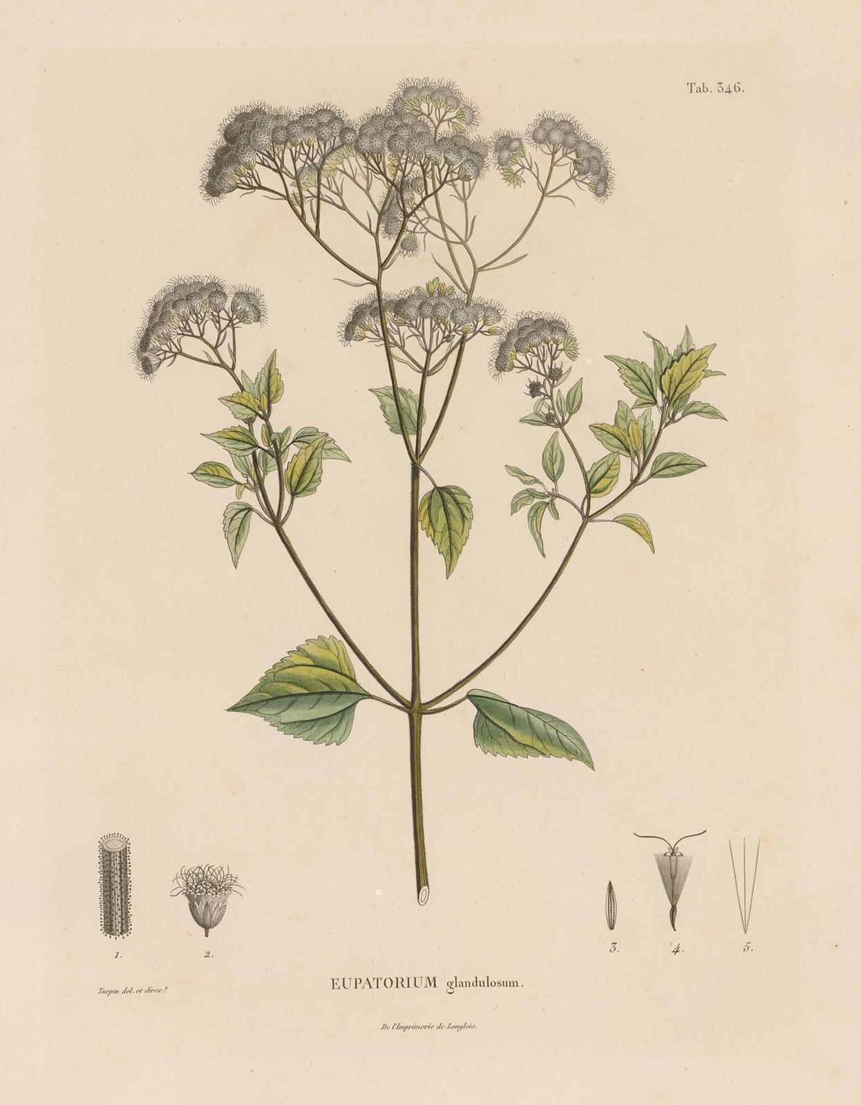 El nombre genérico deriva de la palabra griega ageraton, "que no envejece", por la persistencia de sus flores, un nombre utilizado por Dioscórides para muchas plantas de similares características. El epíteto específico adenophora deriva de los términos aden, 'glándula' y phoros, 'portar'. Precisamente sus duraderas flores y fácil cultivo, ayudaron a que se extendiese por todo el mundo para uso ornamental, a pesar de ser tóxica para muchos animales y para el hombre.Procedencia