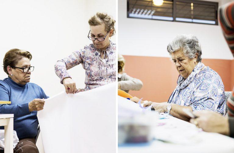 Desde hace un par de semanas en los talleres de costura de El Carmen no se paran las máquinas de coser. A partir de las 6 de la tarde, de martes a jueves, se reúne un grupo de unas 20 mujeres, deseando participar en esta iniciativa, pero sobre todo, poner bonito su barrio. Puntada tras puntada, las mujeres del barrio están cosiendo una a una las fundas de almohada que a partir del día 19 de diciembre se colgarán de los tendederos de todos los bloques del barrio, y claro que es mucho trabajo, si contamos que hay 51 bloques.