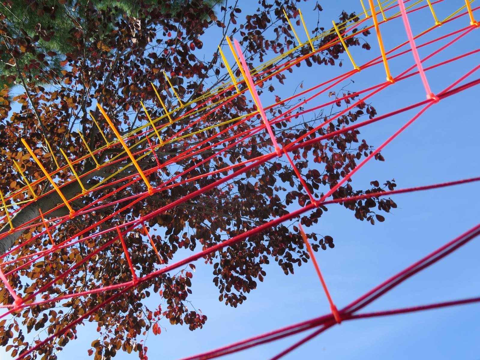 En total se han usado cerca de 2000 metros de cuerda y aproximadamente 8000 bridas. El patrón geométrico se abre creando huecos más grandes donde se colgarán las lámparas de papel hechas el día de la inauguración. De noche, las cuerdas y las bridas se iluminan reflejando la luz que una tira de leds situada en la parte inferior de la red proyecta hacia arriba