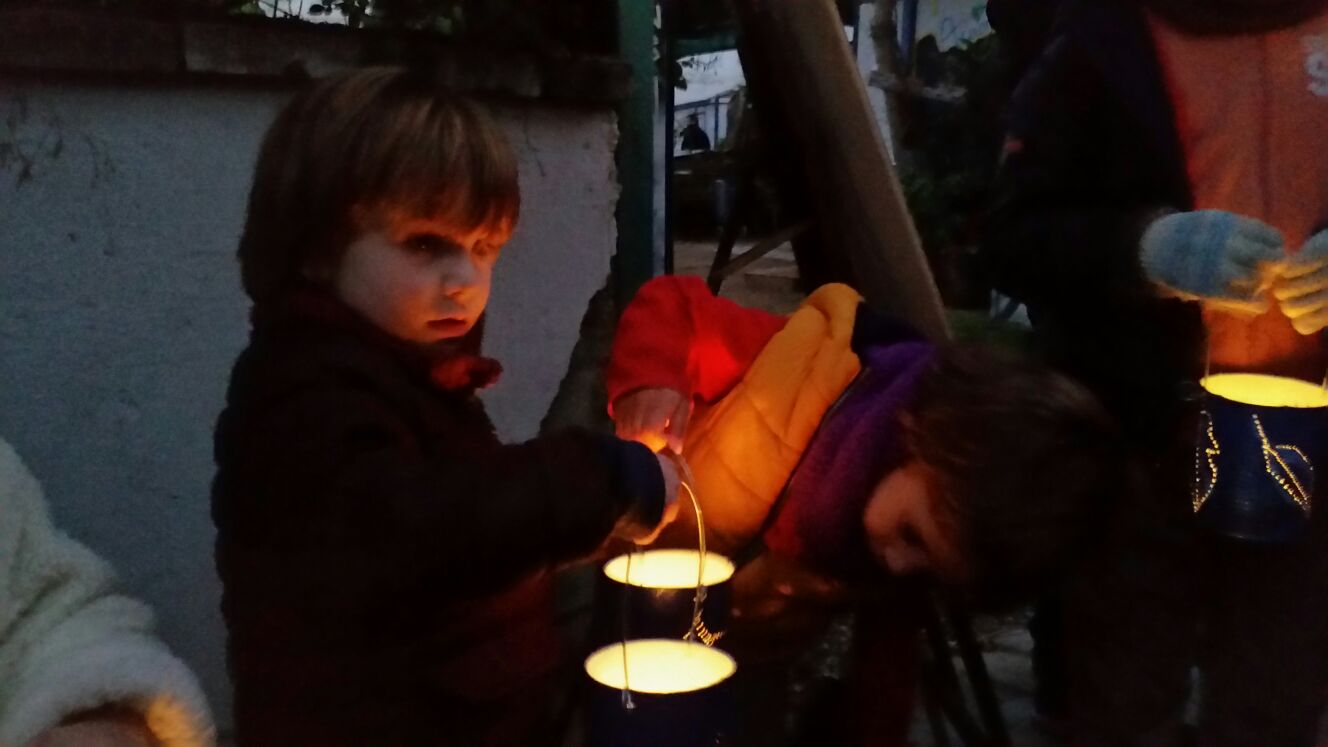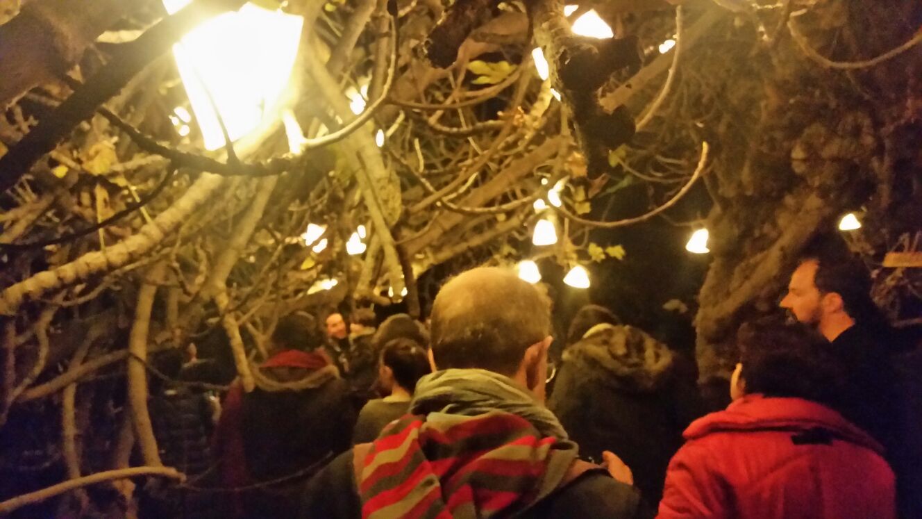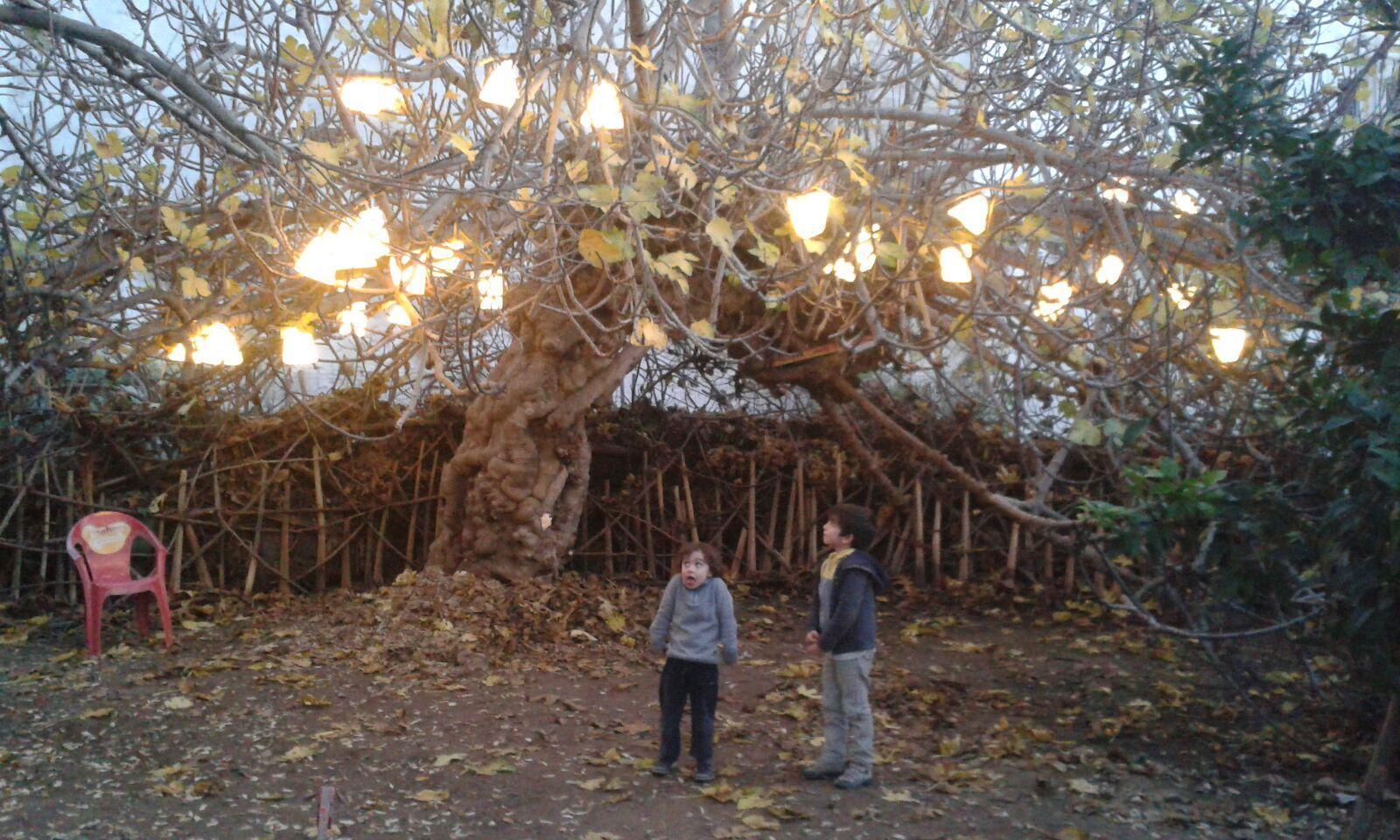 La mañana del 23 de diciembre la pasamos ultimando detalles, acicalando al Huerto del Rey Moro. Terminamos de pintar y perforar las calabazas-lámpara que se colgaron en las ancianas moreras bajo el calorcito del sol invernal, probamos las lámparas de telas estampadas repartidas sobre la higuera, se terminaron de colocar bombillas en otros puntos: el naranjo-limonero o la cúpula geodésica. ¿El resultado de este trabajo de grupo…? ¡Juzgad con vuestros propios ojos!