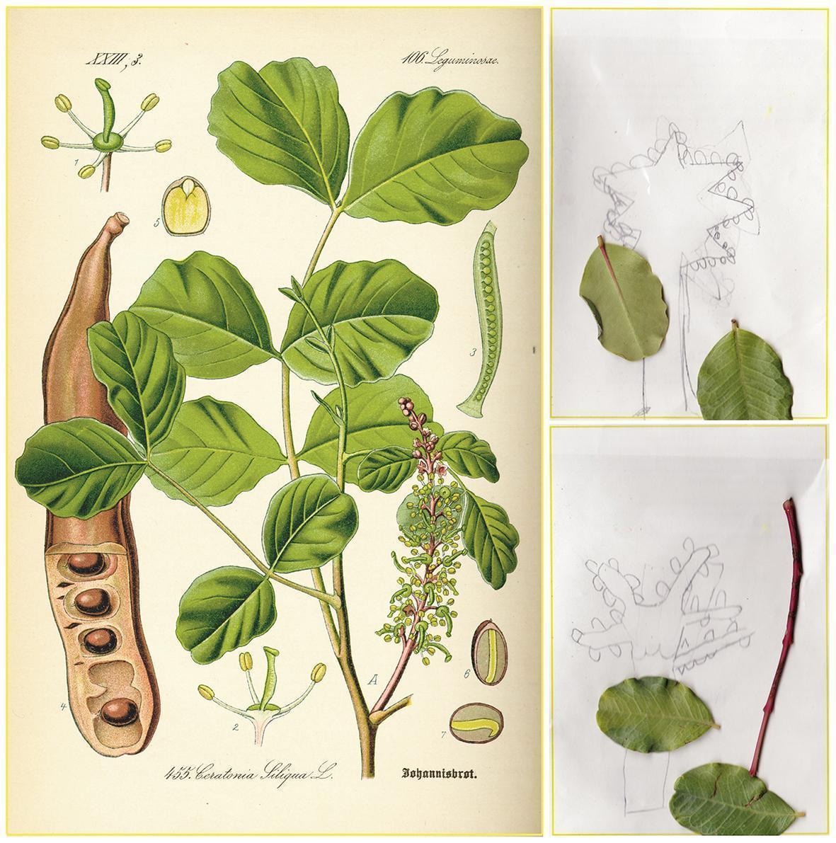Su nombre genérico viene del griego keraton, “cuerno”, en alusión a la forma peculiar de su fruto. El término español algarrobo procede del hispano árabe alharrúba y éste (a través del árabe clásico) del persa harlup que significa literalmente “quijada de asno“. Las semillas de esta humilde fabácea, notablemente uniformes en tamaño y peso, se utilizaron en la Edad Media precisamente por los árabes como unidad de peso para el comercio de las piedras preciosas y metales. La palabra quilate, que proviene del árabe querat, originalmente se refería al peso de una semilla de algarrobo. Al-Andalus, en la Península Ibérica, fue una de las puertas a Europa del oro de Sudán, de ahí la difusión del mismo término por todo el continente.