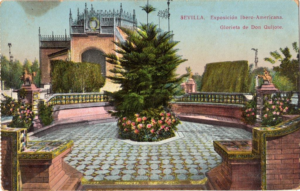 La Glorieta dedicada al autor del Quijote se encuentra situada frente al Pabellón Real de la Plaza de América realizada por Aníbal González. No obstante, el arquitecto fue uno de los principales impulsores de la idea de convertir el parque en una biblioteca pública, propuesta que motivó la creación de espacios como éste, unos entornos destinados a ser lugares donde poder sentarse a leer, al aire libre, obras de los diferentes autores homenajeados en las glorietas.