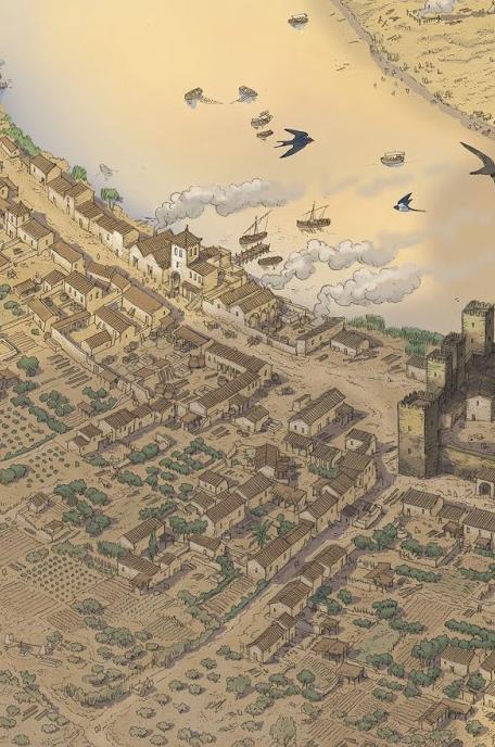 Por el Postigo del Aceite, junto a las Atarazanas, entraría a la ciudad el producto que da nombra a esta puerta. La expedición de Magallanes tuvo a bien de aprovisionarse de este ingrediente esencial de la dieta mediterránea: nada menos que 475 arrobas de aceite, casi unos 5.500 litros repartidos en los 5 barcos. Ilustraciones: Artefacto/ Arturo Redondo