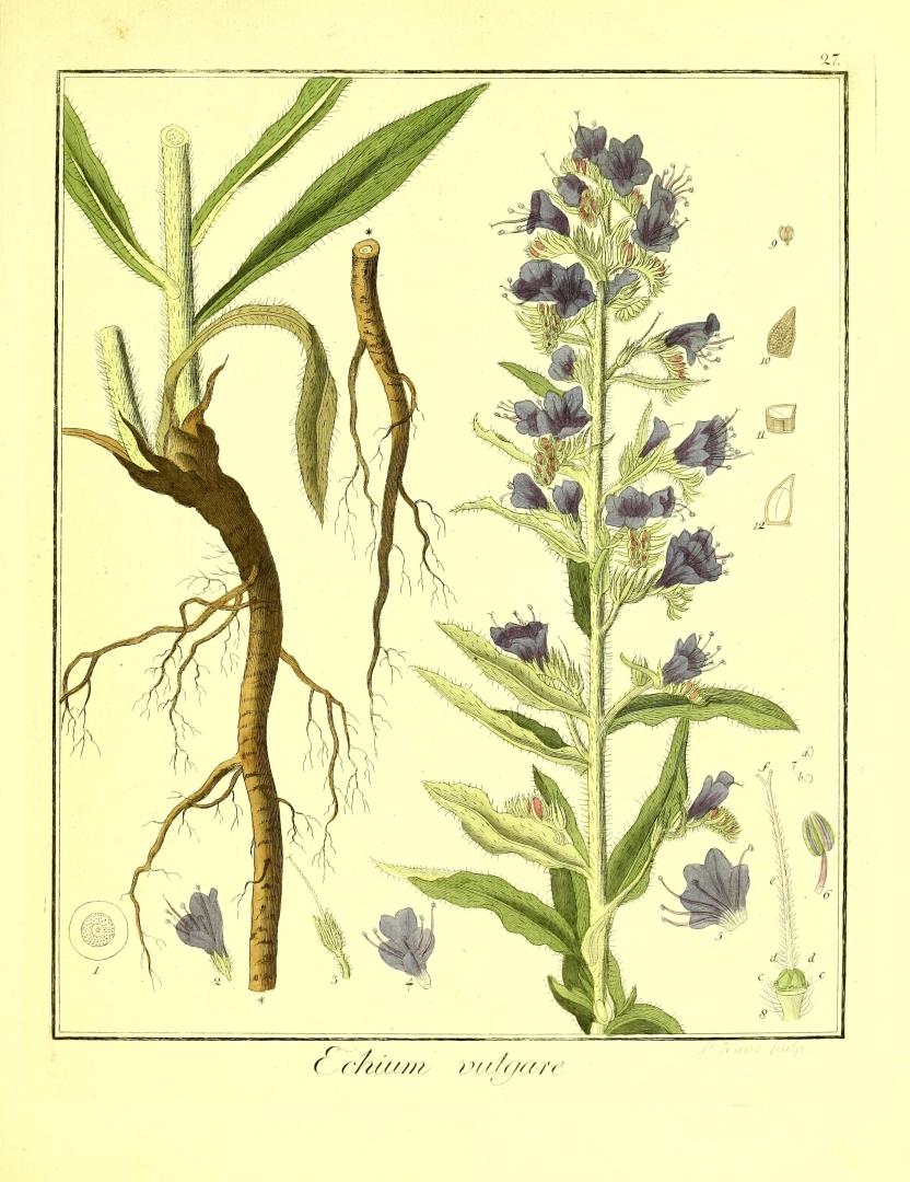 BoraginaceaeEs una herbácea que puede ser anual, bienal o perenne. Durante el primer año forma una roseta de hojas elípticas u oblongo-lanceoladas de hasta 25 cm de largo, cubiertas de pelos rígidos. El segundo año surgen del centro, o de los lados de la roseta, tallos erectos de más de 1 m, poco o nada ramificados, también cubiertos del mismo tipo de pelos y con hojas más pequeñas (unos 9 cm).